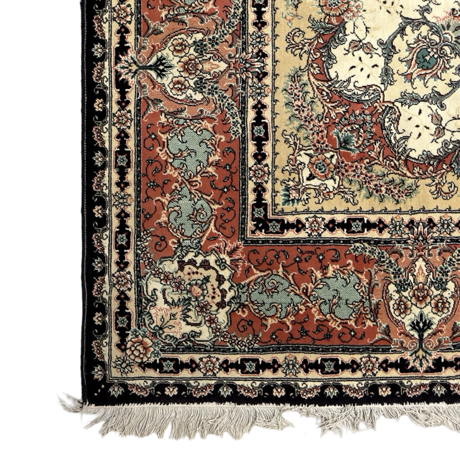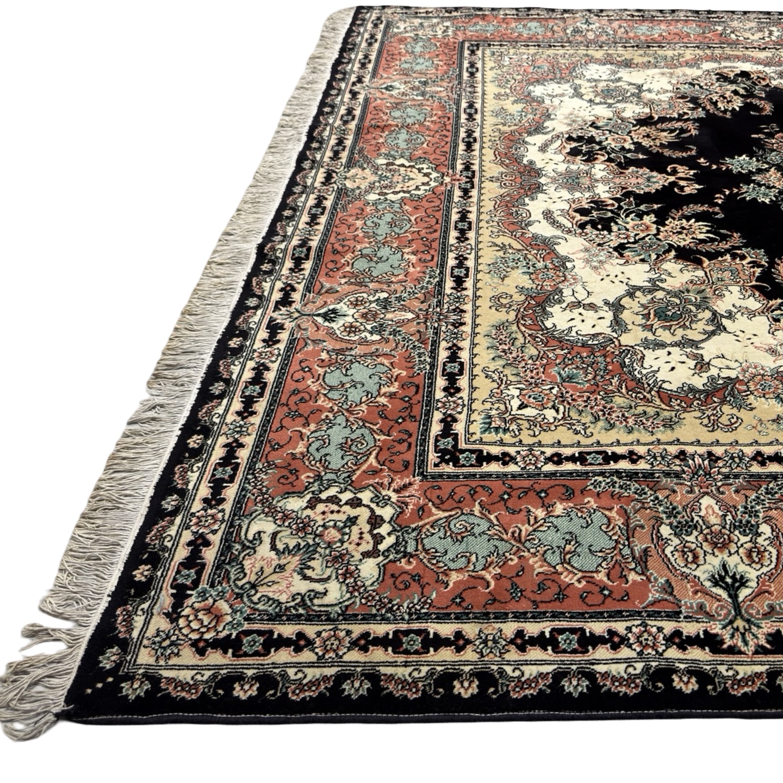 An elegant machine-made Iranian rug crafted from soft synthetic wool with hand-knotted fringes for an authentic Persian finish. It features a detailed medallion design in soothing ivory, teal, grey, and charcoal tones, with fine floral borders that give it a classic, refined look. The pile is smooth, durable, and easy to maintain, making it ideal for everyday use while still carrying the charm of traditional Persian artistry.
